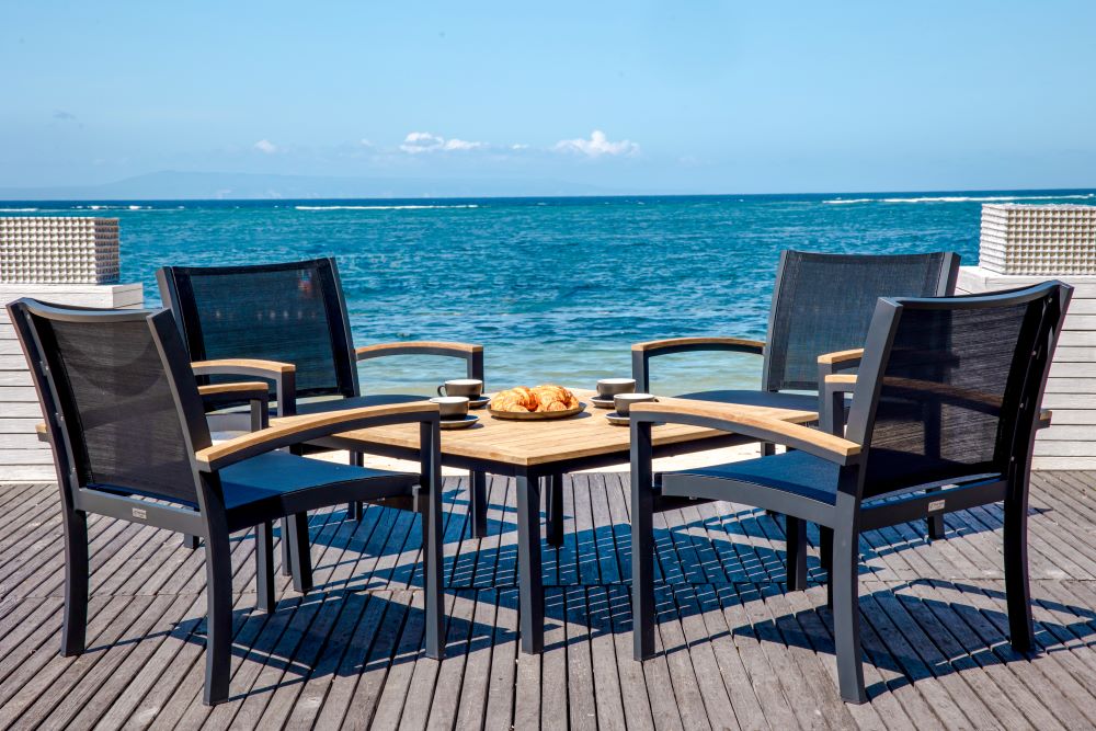 The new Tribeca collection features an arrangement of deep-seating pieces and ottomans that combine the sleek and stylish look of aluminum with timeless teak accents, all pulled together by a form-fitting sling that removes the need for a cushion. The Tribeca single, two-seater and even three-seater are completely stackable.