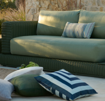 The Laguna modular sectional showcases Meridian’s contemporary aesthetic, while Portofino boasts sophisticated matte-black aluminum frames with dramatic, scalloped edges, topped with waterproof upholstered bolster cushions in a choice of cream or off-white. A coordinating coffee table is also available.