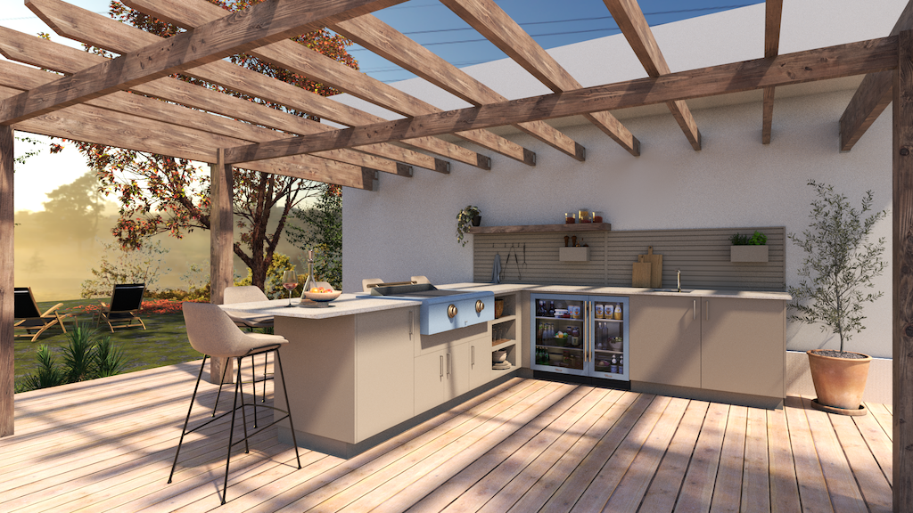 The customizable outdoor kitchen layouts center around the Rockwell Social Grill by Caliber, which features a fully retractable lid that enables 360-degree interactive cooking. Each cabinetry layout features a choice of powder-coated finishes in a rainbow of hues, customizable hardware and multiple configurations.