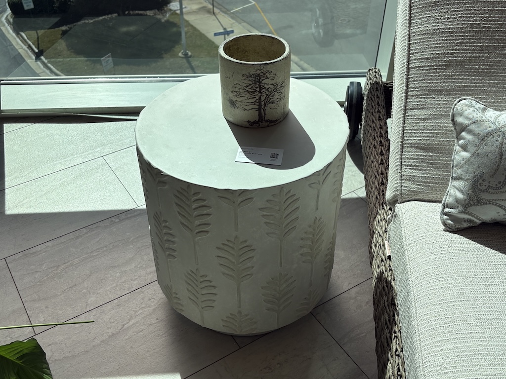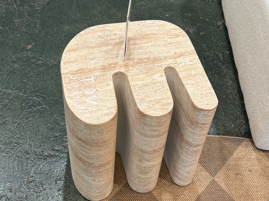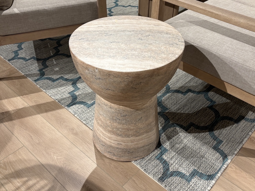 Tov’s Thyme faux travertine side table features an eye-catching design in sturdy reinforced concrete.