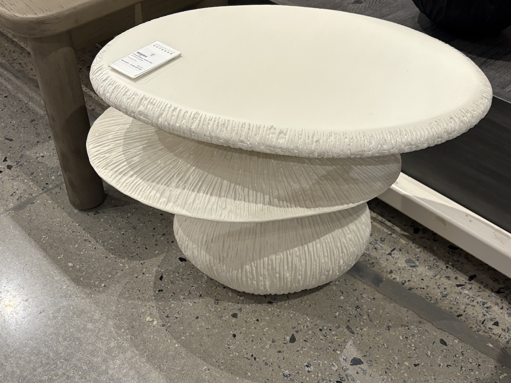The Felicia accent table from Arteriors boasts a gravity-defying asymmetrical design in concrete composite.