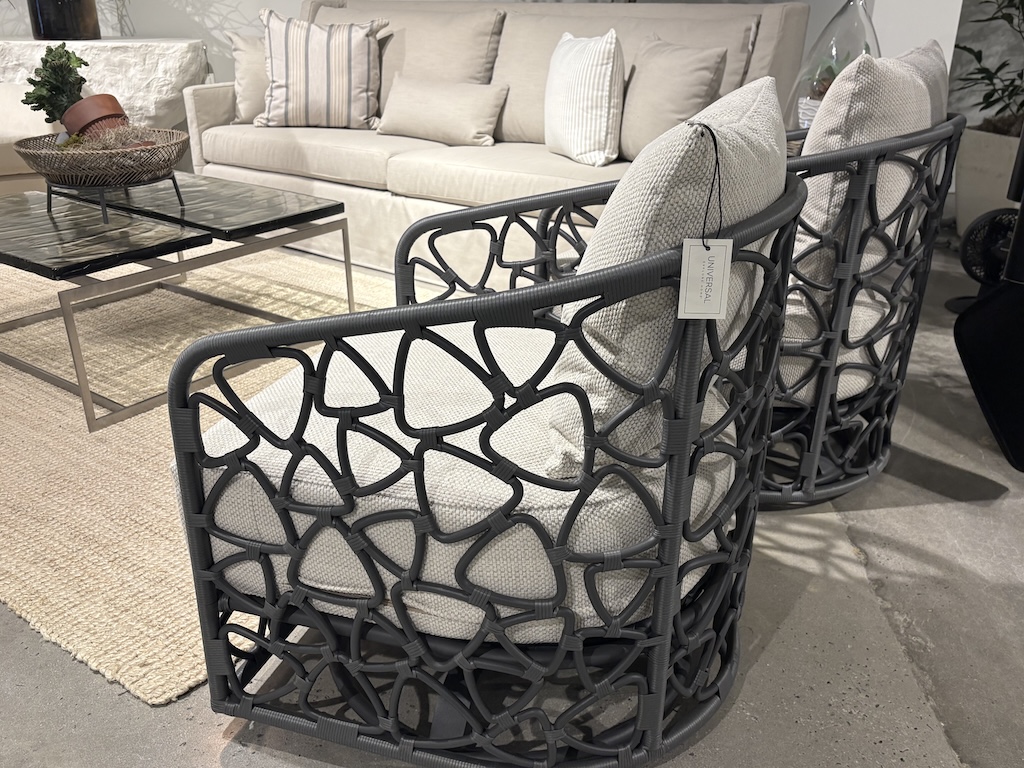 “They made it in a swivel with three finish choices — a taupe, white and charcoal,” said Mary Leigh Howell, public relations representative for Universal. Howell said the chair illustrates how the company’s outdoor collections are influenced by and can work in interior settings.