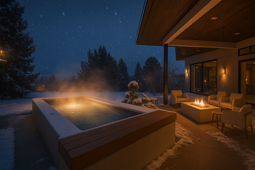 “We designed this spa (above) to be irresistible even on the coldest, snowiest days by positioning it just steps from the door on a generous heated stone deck,” Nate said. “The seamless indoor-outdoor flow celebrates winter rather than fights it, creating a luxurious retreat that transforms harsh weather into the perfect backdrop for relaxation.”