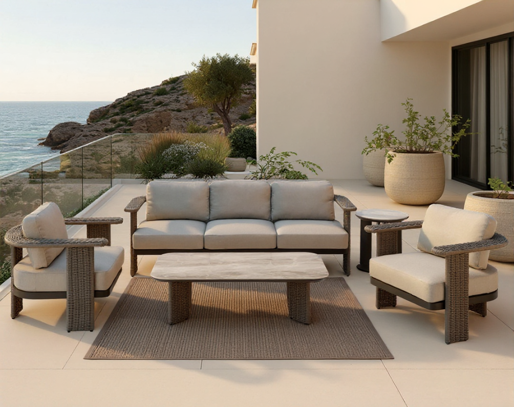 The Ciela features modern, low-profile frames with woven details and an Italian gray sintered stone tabletop. The Leni is Armen Living’s take on luxury outdoor living, a complete collection for dining and lounge featuring a wrought iron design that pairs with concrete dining and occasional tabletops.