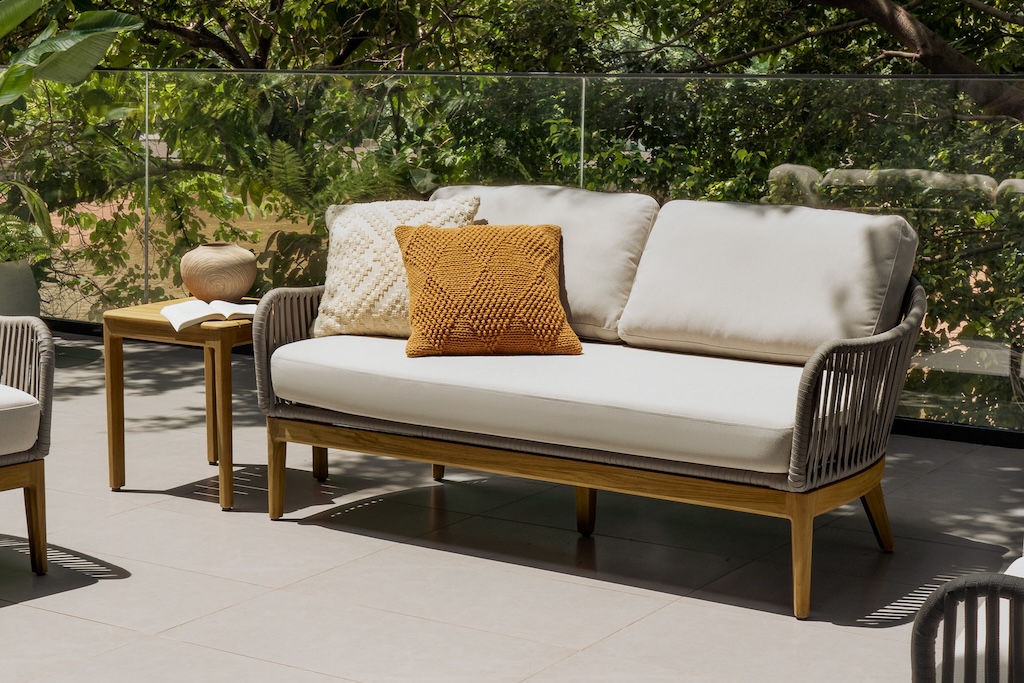 The Isla offers a more bohemian look with handwoven rope detailing over solid teak frames. Pieces include an extendable table with a one-side sliding extension, along with dining chairs and a dining bench with detachable cushions.