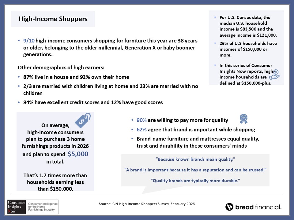 Consumer Insights Now surveyed 825 United States consumers in February. Respondents all have household incomes of $150,000 or more, and all purchased or plan to purchase new furnishings in 2026. All respondents are either the primary or joint furniture purchase decision-maker. The survey was sponsored by Bread Financial.