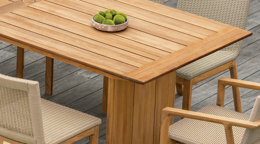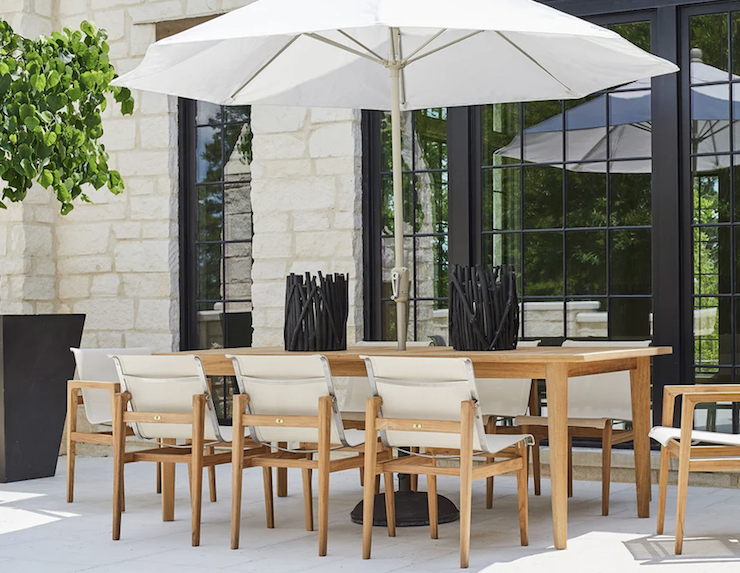 Kingsley Bate’s Cortona dining table blends substantial proportions with refined, transitional elegance. The expansive top features wide Grade A teak planks that showcase the wood’s natural grain and tonal depth. Sculptural slab legs with subtle vertical detailing anchor the design, achieving a masterful balance between visual weight and sophisticated restraint. Showroom: IH111
