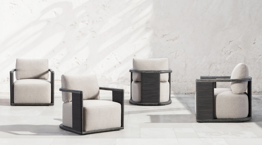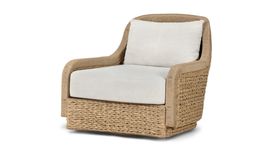 For a casual, coastal vibe, this outdoor chair from Four Hands takes on the classic slipper silhouette with added dimension and movement atop a 360-swivel base. It’s all about the heavy braided weave technique: Faux banana leaf comes together in a mix of weave formats for added visual interest, finishing with a cord wrap detail on the arms. Showroom: Showplace, Floor 4.